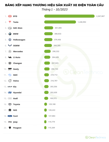 Bảng xếp hạng thương hiệu sản xuất xe điện toàn cầu từ tháng 1 đến tháng 10/2023